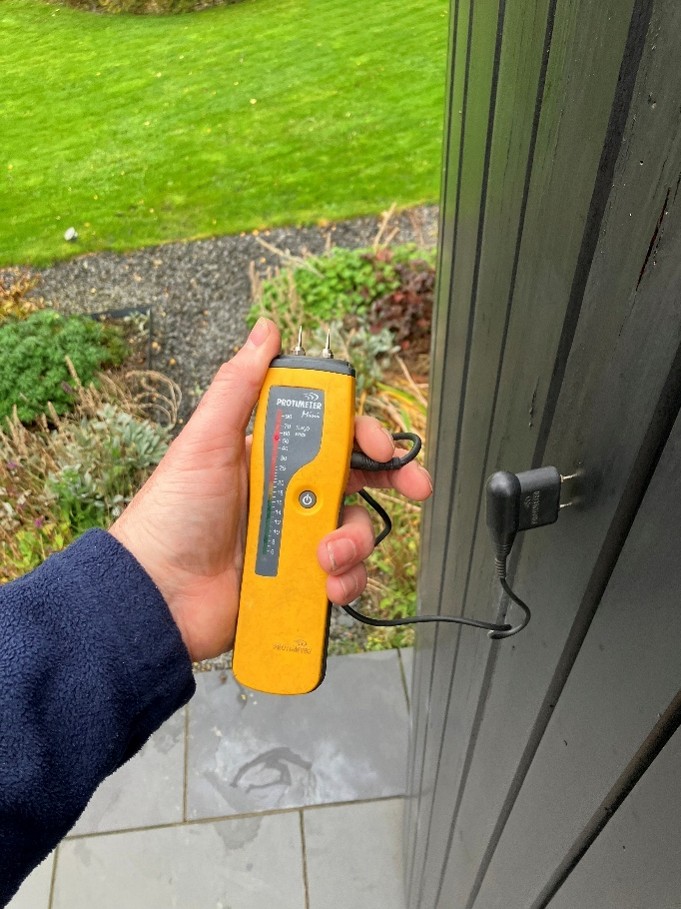 Although the cladding was generally well designed and constructed, localised detailing issues were identified. Board ends positioned too close to the ground and in contact with window sills had created areas of persistent wetting within the splash zone, leading to elevated moisture levels and sapwood decay. Annual re-coating had also resulted in an overly thick, low-permeability finish, further contributing to moisture retention.