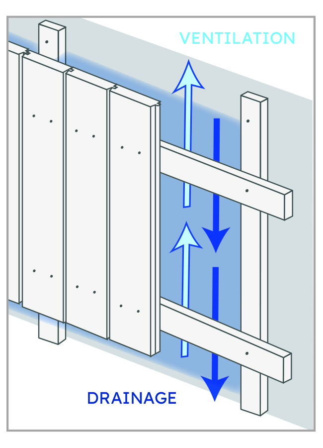 For vertical cladding, add horizontal counter battens to maintain good ventilation and drainage. These should be at least 50mm wide and 25mm thick.